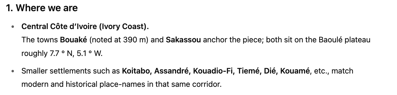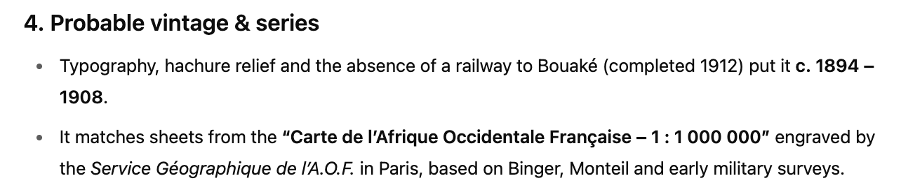 Then I gave the same prompt to o3. This time, the model took over three minutes, carefully analyzing it before concluding the fragment was likely a region of Côte d’Ivoire, from 1894 to 1908. It was right. The map is, in fact, an 1894 French map from Côte d’Ivoire.